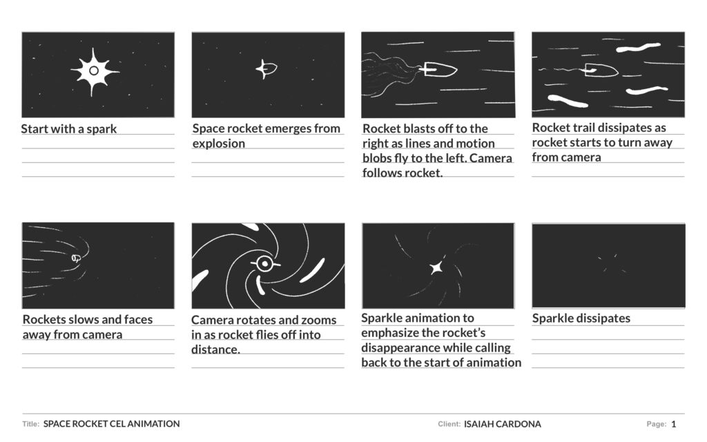 To help me plan out my animation, I storyboarded a sequence that began with a blast and showed the rocket emerging and then flinging forward in space before it turned and flew into a wormhole. Through the storyboarding process, I planned for the animation to be bookend with two sparkle/explosion effects at the start and end of the animation.